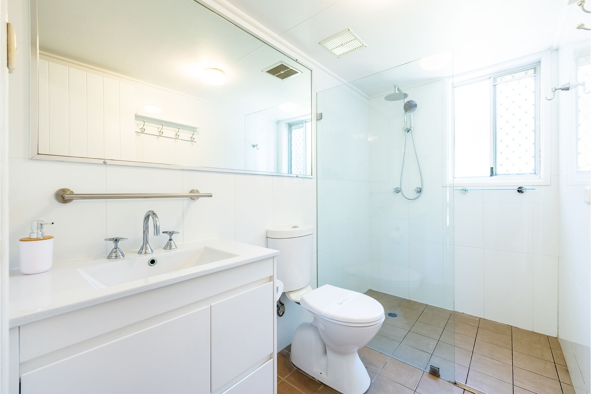Two bedrooms and the main bathroom are also located on the upper level, the main bedroom is complete with a Queen size bed, split system air conditioner, ceiling fan and ensuite with shower, toilet, and single vanity. Bedroom two has a Queen bed and ceiling fan and the main bathroom is fitted with a spa bath that can comfortably fit two-adults, walk-in shower, toilet, and vanity.