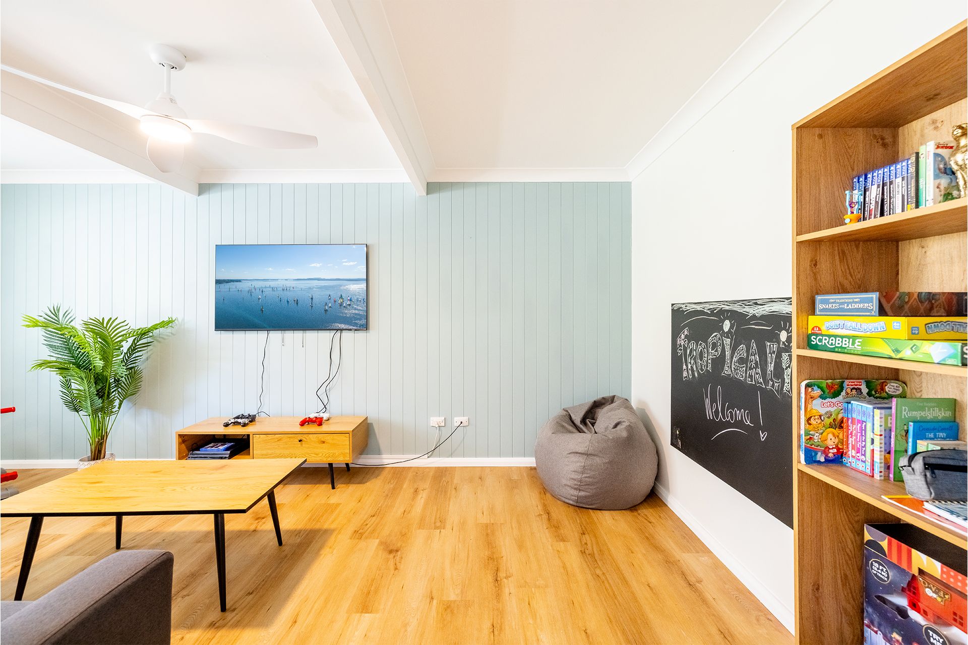 The second living area has been created as a game room for children and children at heart with a Smart TV, ceiling fan, PlayStation 4 with 4 remote controllers and a wide range of PlayStation games (solo and multiplayer, for both adults and children), a large chalkboard, books, and several games for inside or outside. The game room can be turned into a fifth bedroom if required as the sofa can be converted into a double bed (better suited for kids). Unlimited NBN internet access with Wi-Fi is offered at the property.