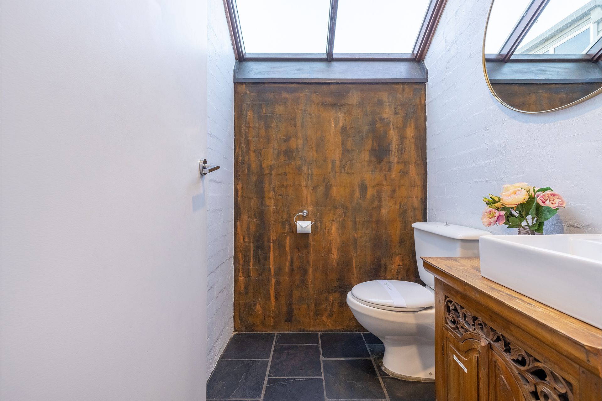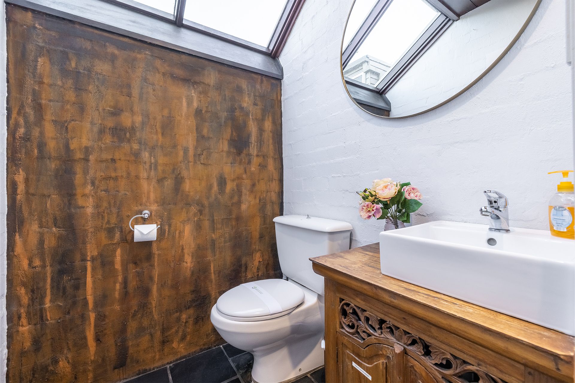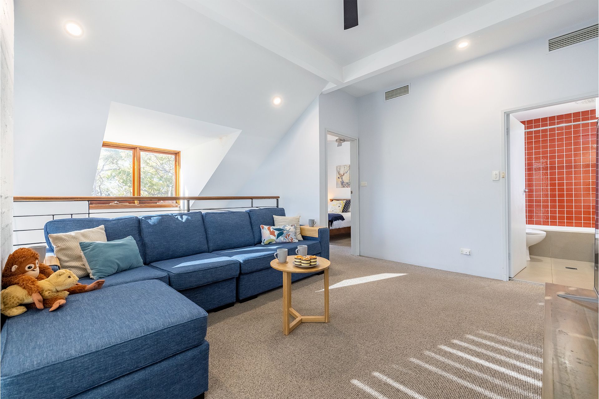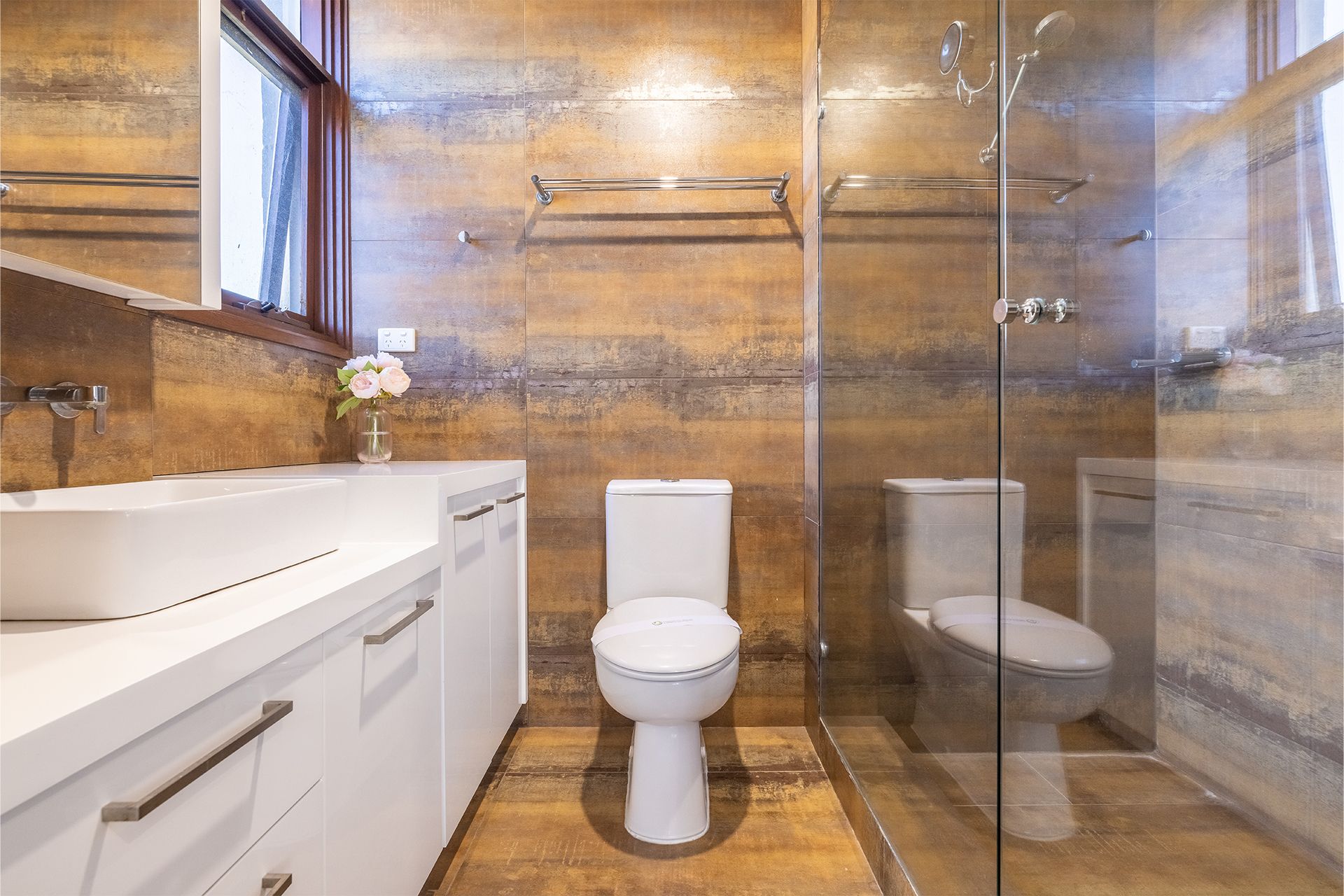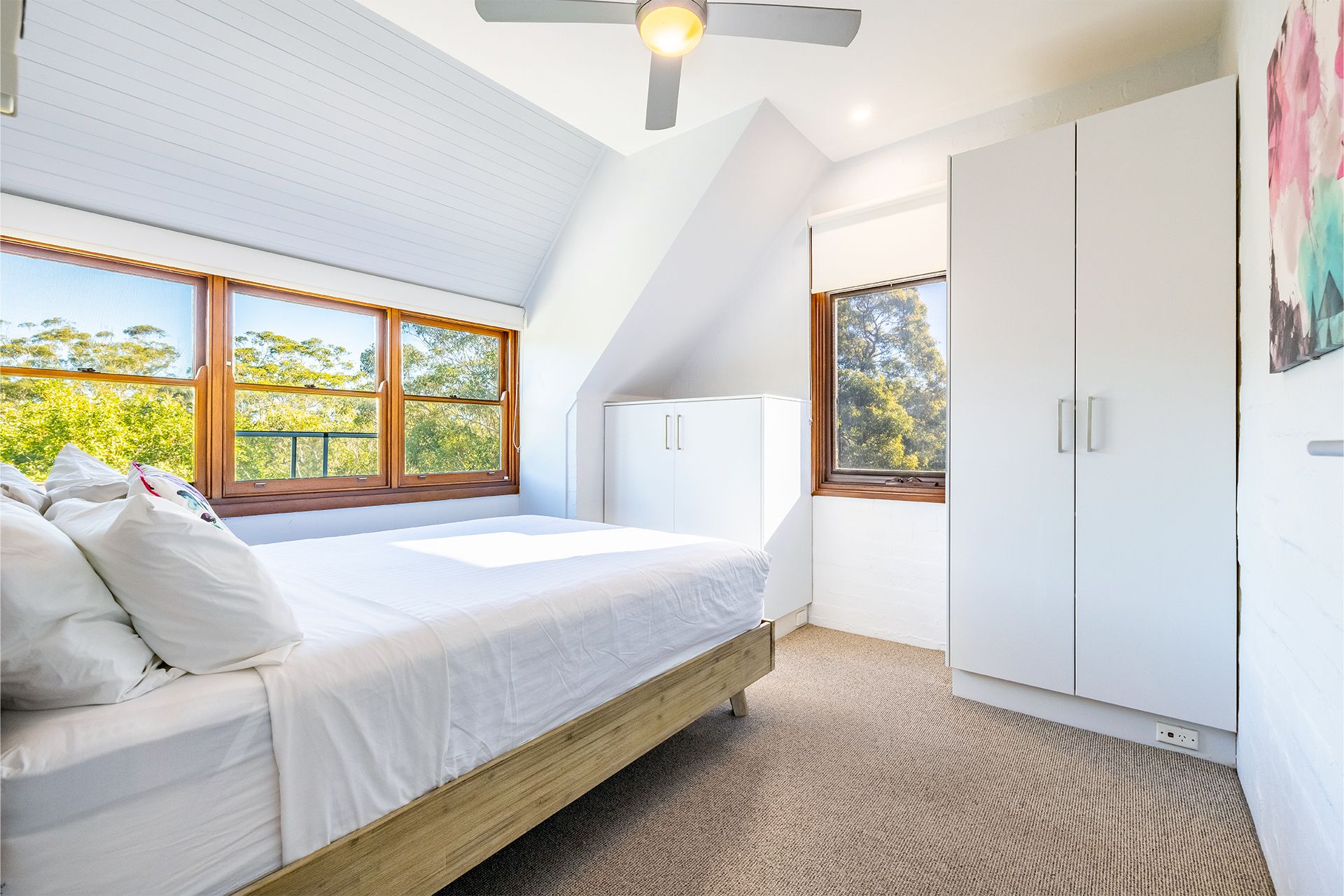 Upstairs has two bedrooms both with ceiling fans, main bathroom and an air-conditioned living area with smart TV, games, and books. The main bedroom also has a walk-in robe, renovated ensuite with toilet, shower and vanity and a private balcony with small table and chairs to start the morning off with a coffee whilst admiring the views, birdlife, and peace. The main bathroom looks out and captures the stunning treetops, there is a shower over the top of the bath, toilet, and vanity.