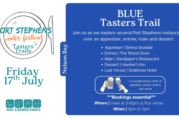 Join us on our BLUE Taster’s Trail on Friday 17th July throughout Nelson Bay CBD as part of the 2026 Port Stephens Winter Festival. Enjoy an appetiser, entrée, main and dessert at the following restaurants Appetiser… – Sirena Seaside | Housemade Arancini with pea/pesto & mozzarella filling Entree – The Wood Oven | Brushetta Pizza Main – Sandpiper’s Restaurant | Pan-seared Atlantic Salmon & Scallops with petite Potatoes, broccolini, pumpkin puree & beurre blanc sauce Dessert – The Hawker’s Inn | Mango Pancakes Last Venue – Seabreeze Hotel | 1x Complimentary Drink **Appetiser, entree, main & last venue include a complimentary drink** Tickets go on sale from 22nd April Bookings are essential – please leave your email address when booking to receive notifications from the event organiser. **Name badges and coloured wrist bands will be issued on arrival at the first venue. Host details will be provided closer to the date and notified via email**