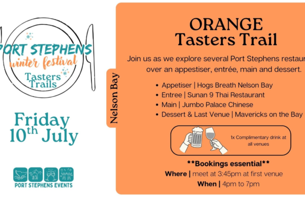 Join us on our ORANGE Taster’s Trail on Friday 10th July throughout Nelson Bay CBD as part of the 2026 Port Stephens Winter Festival. Enjoy an appetiser, entrée, main and dessert at the following restaurants Appetiser… – Hogs Breath Nelson Bay | Duo of Crispy Chicken Wings (JD BBQ Sauce & Buffalo Sauce with Blue Cheese) Entree – Sunan 9 Thai Restaurant | Mixed Entree (Satay Chicken Skewer, Curry Puff & Scallop in Ocean Soy Sauce) Main – Jumbo Palace Chinese Restaurant | ALTERNATIVE DROP – Beef Black Pepper & Boiled Rice OR Chicken Chow Mein with Crispy Noodle Dessert & Last Venue – Mavericks on the Bay | Tiramisu & Coffee Cream **All venues include a complimentary drink** Tickets go on sale from 22nd April Bookings are essential – please leave your email address when booking to receive notifications from the event organiser. **Name badges and coloured wrist bands will be issued on arrival at the first venue. Host details will be provided closer to the date and notified via email**
