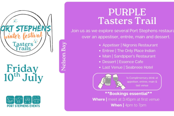 Join us on our PURPLE Taster’s Trail on Friday 10th July throughout Nelson Bay CBD as part of the 2026 Port Stephens Winter Festival. Enjoy an appetiser, entrée, main and dessert at the following restaurants Appetiser… – Nigronis Restaurant | Prawn Cocktails Entree – The Only Place Indian | Mix Entree (1x Samosa, 1 Lamb Seek Kebaba, 1x Onion Spinach Bhaji & 1 Chicken Tikka) Main – Sandpipers Restaurant | Pan-seared Atlantic Salmon & Scallops with petite Potatoes, broccolini, pumpkin puree & beurre blanc sauce Dessert – Essence Cafe | Affogato Last Venue – Seabreeze Hotel | 1x Complimentary drink **Appetiser, entree, main & last venue include a complimentary drink** Tickets go on sale from 22nd April Bookings are essential – please leave your email address when booking to receive notifications from the event organiser. **Name badges and coloured wrist bands will be issued on arrival at the first venue. Host details will be provided closer to the date and notified via email**