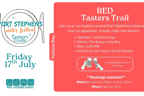 Join us on our RED Taster’s Trail on Friday 17th July throughout Nelson Bay CBD as part of the 2026 Port Stephens Winter Festival. Enjoy an appetiser, entrée, main and dessert at the following restaurants Appetiser… – Good Kravings | Mix Entree (Pork Skewer, Spring Rolls & Dim Sims) Entree – The Buoys at the Bay | pan-fried Scallop, served with Butternut Pumpkin Risotto & Lemon Thyme Foam & Soft Herbs Main – Cafe KIN | Prawn & Scallop Sliders Dessert & Last Venue – Sirena Seaside | Limoncello Tiramisu **All venues include a complimentary drink** Tickets go on sale from 22nd April Bookings are essential – please leave your email address when booking to receive notifications from the event organiser. **Name badges and coloured wrist bands will be issued on arrival at the first venue. Host details will be provided closer to the date and notified via email**