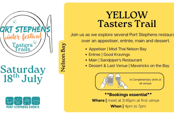 Join us on our YELLOW Taster’s Trail on Saturday 18th July throughout Nelson Bay CBD as part of the 2026 Port Stephens Winter Festival. Enjoy an appetiser, entrée, main and dessert at the following restaurants Appetiser… – Mod Thai Nelson Bay | Mix Entree (Spring Roll, Curry Puff, Satay Chicken Skewer & Money Bag) Entree – Good Kravings | Mix Entree (Pork Skewer, Spring Rolls & Dim Sims) Main – Sandpiper’s Restaurant | Pan-seared Atlantic Salmon & Scallops with petite Potatoes, broccolini, pumpkin puree & beurre blanc sauce Dessert & Last Venue – Mavericks on the Bay | Nutella & Strawberry Crepes **All venues include a complimentary drink** Tickets go on sale from 22nd April Bookings are essential – please leave your email address when booking to receive notifications from the event organiser. **Name badges and coloured wrist bands will be issued on arrival at the first venue. Host details will be provided closer to the date and notified via email**